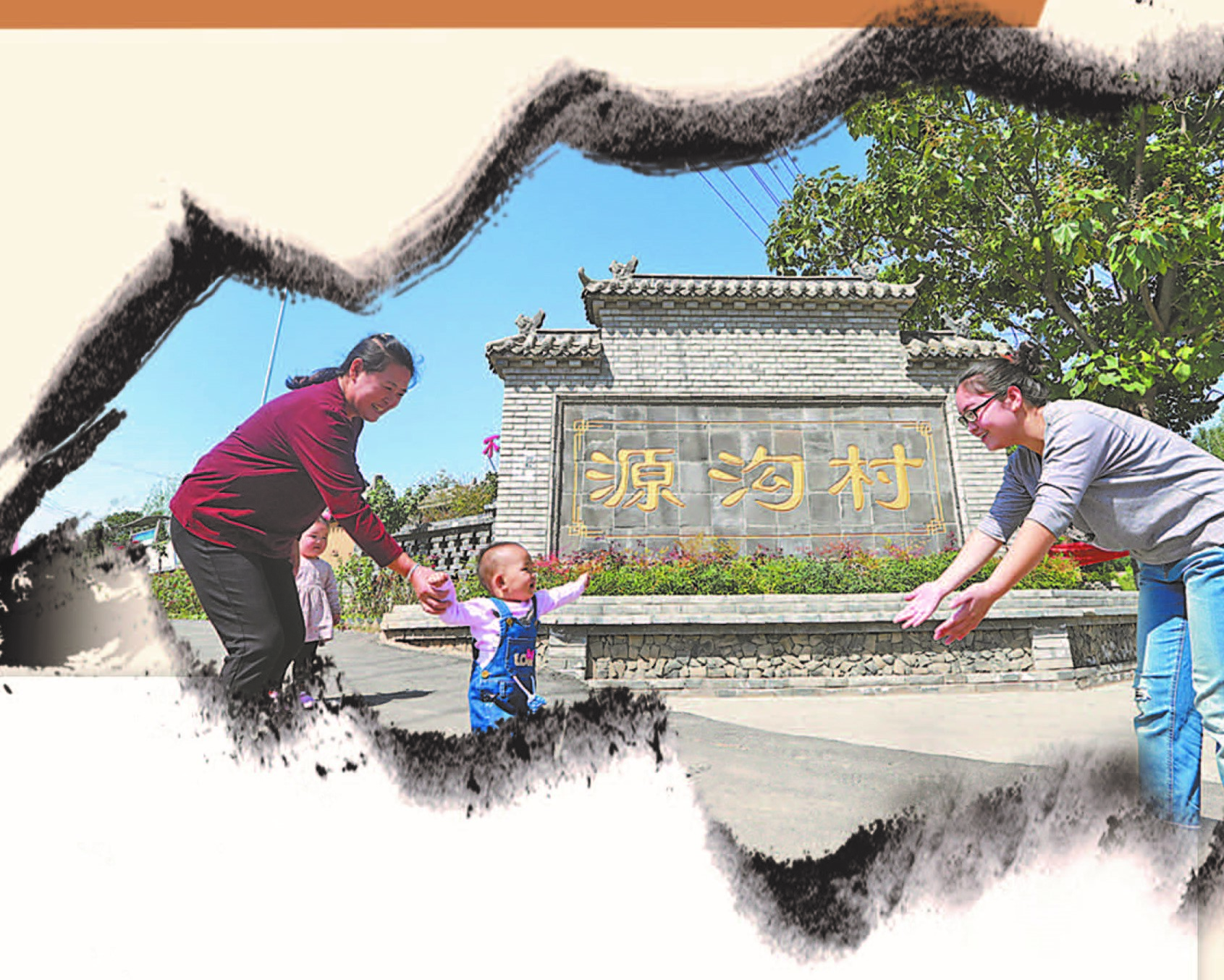 右上图 源沟村的村名墙面下,孩子正在学步。